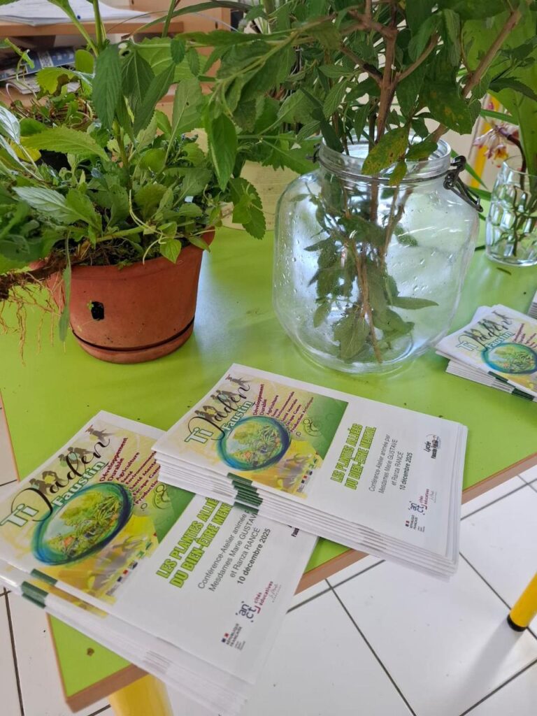 Mercredi 10 décembre 2025, le CDI a accueilli l’atelier/conférence « Les plantes alliées du bien-être mental », animé par Mme GUSTAVE, présidente d’honneur de l’APLAMEDAROM, et Mme RANCE. Cette rencontre, organisée par Mme BERCHEL dans le cadre du projet Ti Jaden Faustin, a permis aux participants de découvrir comment certaines plantes locales peuvent soutenir l’équilibre mental au quotidien.
