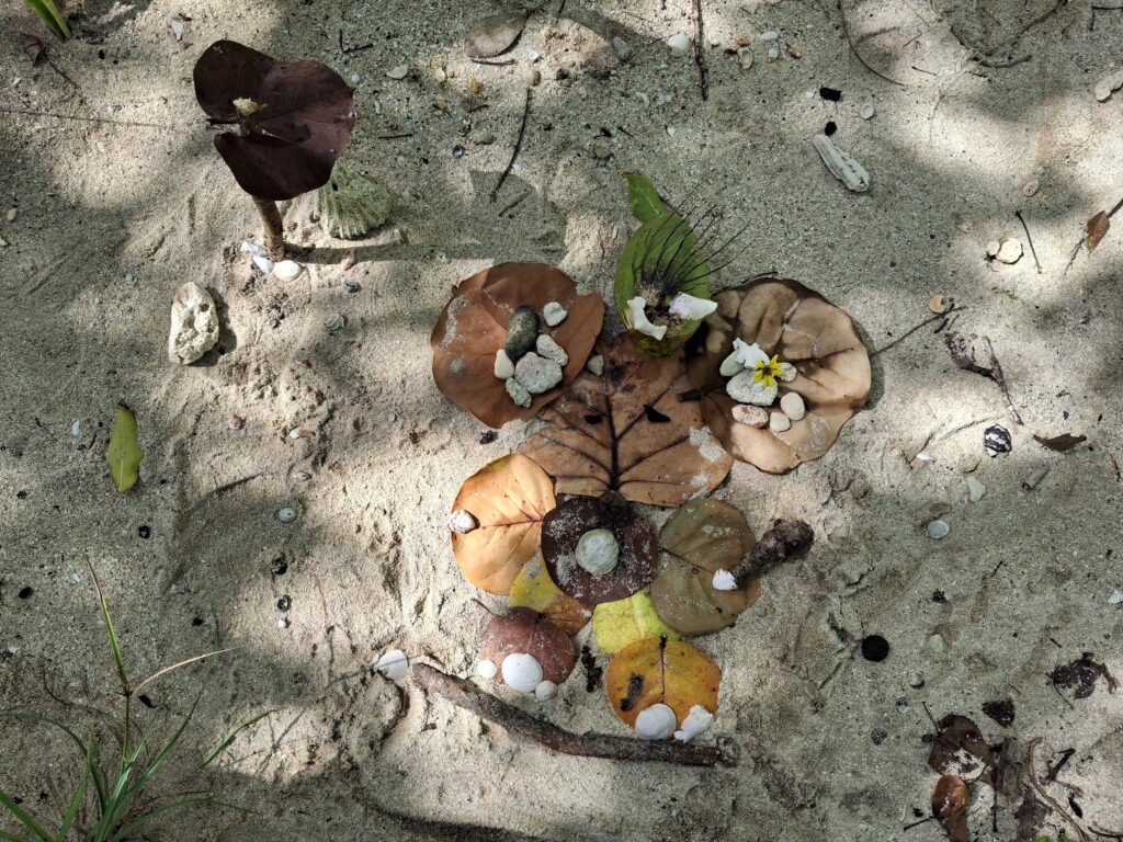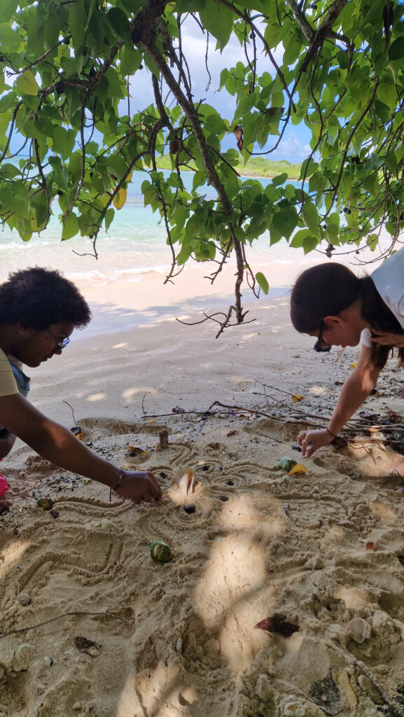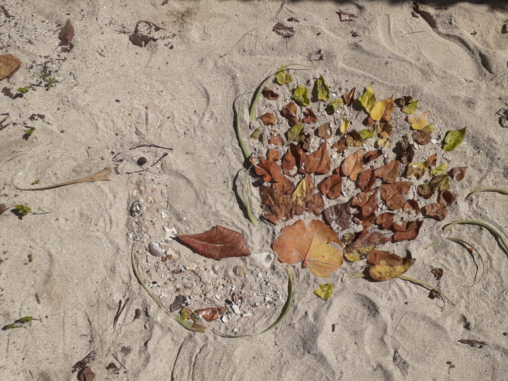 Après leur arrivée en car à Port-Louis, les élèves ont reçu pour consigne de se promener en observant attentivement leur environnement tout en ramassant des éléments naturels intéressants sur le chemin. Cette première étape les invitait à porter un regard sensible sur la nature. Une fois arrivés sur le site choisi, un premier exercice a consisté à repérer et collecter les traces laissées autour d’eux en prenant les empreintes à l’aide de feuilles de papier et de crayons. Ces observations ont permis d’affiner leur regard et de préparer la phase de création.